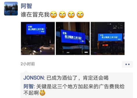 也许是每个男人都能从阿涂身上看到自己的影子,一时间大家争相在朋友圈模仿起来,把照片中的“阿涂”改成自己的名字,像是自己包下这LED屏幕向老婆道歉一样,隔着屏幕都能感受到大家喝酒后面对老婆恐惧。